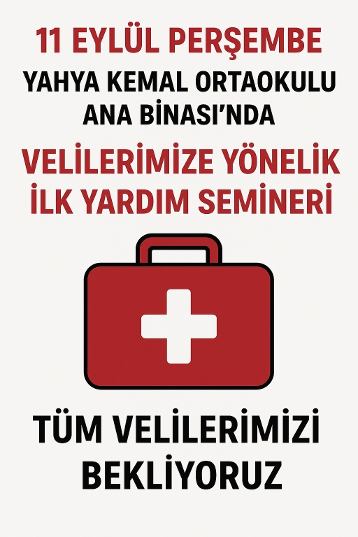 11 Eylül Perşembe günü saat 09.10 - 09.50 saatleri arasında Bayrampaşa ilçe Milli eğitim müdürlüğü tarafından konferans salonunda velilerimize yönelik İlk yardım semineri düzenlenecektir. Tüm velilerimize duyurulur.